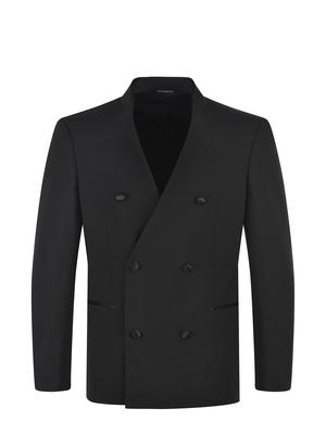 Giacca Emporio Armani in lana strech Nero. Chiusura doppiopetto con bottoni in raso. Maniche lunghe con bottoni. Tasche a filo con profili in raso. 96% klana vergine 4% elastene