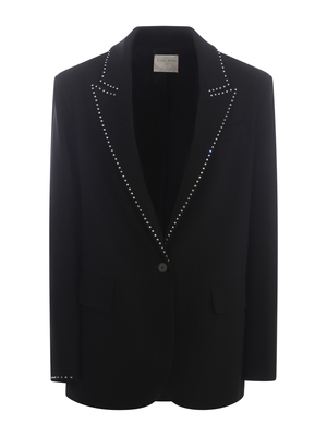 Giacca Forte Forte realizzata in twill di lana e viscosa di colore Nero. Rever a lancia. Dettaglio " Strass" applicati sul rever. Tasca a filo sul petto. Maniche lunghe. Polso dx con strass, quattro bottoni. Monopetto. Chiusura con un bottone. 79% Viscosa, 18% Lana Vergine Made in Italy