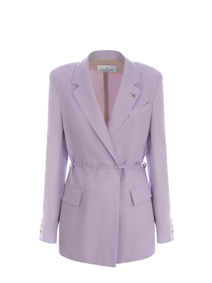 Giacca Manuel Ritz realizzata in lino di colore Lilla. Collo con rever. Dettaglio spilla iconica applicata sul rever. Maniche lunghe. Polsi con tre bottoni. Tasca a filo sul petto. Chiusura con bottone a scomparsa. Cintura in vita abbianata. Tasche con patta laterali. Spacco centrale sul retro. Regular fit. 100% Lino