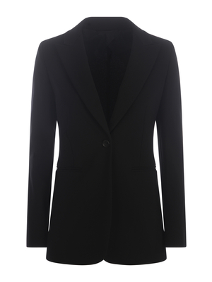 Giacca Max Mara " Circeo" realizzato in jersey di viscosa di colore Nero. Collo a rever. Maniche lunghe. Chiusura monopetto, bottone singolo. Tasche a filo laterali. Linea semiaderente. Semifoderato, tessuto stretch monogram. Spacco centrale sul retro. Fodera 68% Acetato, 32% Poliestere 78% Viscosa, 16% Poliammide, 6% Elastan Made in Italy Abbinata ai pantaloni " Lari"art. 2317860439600012-001 Gilet " Rodi" art. 2319160439600012-001