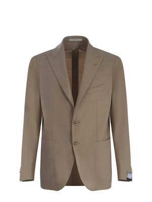 Giacca Tagliatore realizzata in fresco lana stretch di colore Beige. Collo con rever classico. Spilla iconica del brand applicata sul rever. Maniche lunghe. Polsi con quattro bottoni. Tasca a filo sul petto. Monopetto. Chiusura monopetto con due bottoni. Tasche applicate ai lati. Doppio spacco sul retro. Orlo dritto. 99% Lana Vergine, 1% Elastan Made in Italy