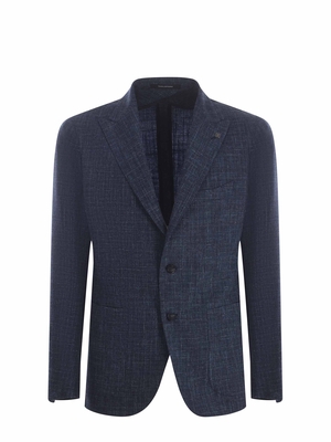 Giacca Tagliatore realizzata in misto cotone e lino di colore Blu. Effetto denim. Collo con rever classico. Spilla iconica del brand applicata sul rever. Maniche lunghe. Polsi con quattro bottoni. Tasca a filo sul petto. Monopetto. Chiusura monopetto con due bottoni. Tasche applicate ai lati. Doppio spacco sul retro. Orlo dritto. 44% Cotone, 44% Lana Vergine, 11% Lino, 1% Elastan Made in Italy