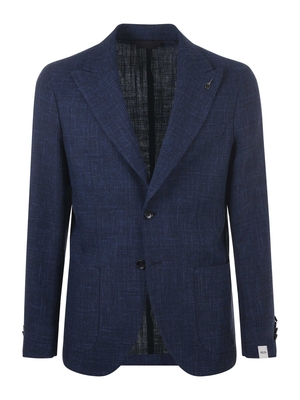 Giacca Paoloni in hopsack di misto cotone e lino Blu scuro melange. Rever a lancia. Spilla iconica sul rever. Chiusura con 2 bottoni. Taschino. Tasche a toppa. Doppio spacco sul retro. Sfoderata. Misura in foto 4844% lana vergine, 43% cotone, 11% lino, 2% elastene