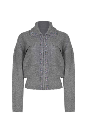 Giacca Pinko " Dark Lady" realizzata in misto lana di colore Grigio. Effetto bouclé. Colletto. Chiusura frontale con zip. Tasche con patta sul petto. Maniche lunghe. Finiture con perline gioiello a contrasto ricamate.46% acrilico 20% poliestere 16% nylon 15% lana