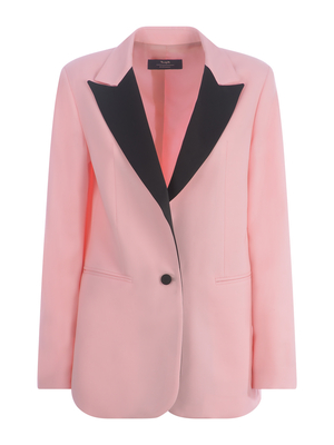 Giacca Manuel Ritz in fresco lana di colore Rosa. Collo con rever in raso a contrasto Nero. Maniche lunghe. Chiusura monopetto con un bottone. Tasche a filo di lato. Spacchetto sul retro.100% Lana Vergine Made in Italy