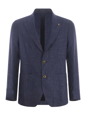 Giacca Tagliatore in misto lino e lana di colore Blu. Trama spigatina. Revers a lancia. Spilla iconica applicata sul revers. Taschino sul petto. Maniche lunghe. Polsi con quattro bottoni. Tasche applicate di lato. Chiusura con due bottoni. Doppio spacco sul retro. Sfoderata. Decostruita. 60% Lino, 40% Lana Made in Italy