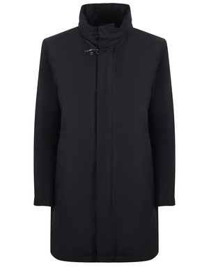 Giaccone Fay in nylon Nero. Trattamento anti goccia. Imbottito in ovatta tecnica. Collo alto con cappuccio inserito all'interno. Gancio iconico al sottogola. Chiusura con zip e bottoni nascosti da fintone. Tasche diagonali. Tasca interna con zip. Patch logo applicata all'interno. Misura in foto M100% poliestere Imbottitura: 100% poliestere