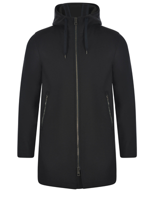 Giaccone Herno realizzato in nylon di colore Blu Scuro. Cappuccio con coulisse. Maniche lunghe. Tasche laterali con zip. Chiusura con zip, doppio cursore. Logo " Herno" in metallo applicato sul retro del cappuccio. 75% Lana Vergine, 25% Poliammide Made in Italy