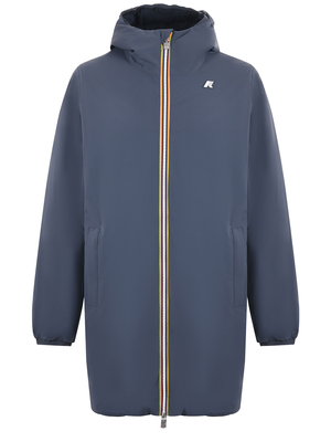 Giaccone K-Way reversibile in nylon stretch Avion/ Blu scuro. Imbottito in ovatta. Impermeabile. Idrorepellente. Antivento. Cappuccio con bordo elastico. Chiusura con zip doppio cursore. Tasche su entrambi i lati. Fitting slim. Logo frontale. Misura in foto M92% nylon, 8% elastene Imbottitura: 100% poliestere