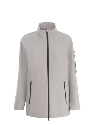 Giubbino Max Mara Leisure " Prater" realizzato in tela tecnica gommata di colore Mastice. Inserti a contrasto Nero. Collo alto. Maniche lunghe reglan. Polsi antivento. Chiusura con zip, doppio cursore. Tasche laterali. Antivento, impermeabile e traspirante. Linea leggermente sfiancata. Contropiega sul retro, con alamaro e bottone a pressione. Fodera 100% Poliammide 100% Poliammide Made in Italy
