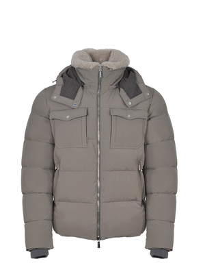 Giubbino Moorer " Alarick" realizzato in poliammide di colore Cappuccino.marronedesign trapuntato.colletto rialzato con pelliccia.cappuccio rimovibile.tasche ad aletta.polsini in maglia.chiusura frontale con zip.88% poliammide 12% poliuretano Made in Italy