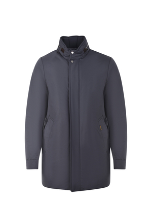 Giubbino Moorer in tessuto tecnico Blu navy. Cappuccio nascosto nel collo. Doppia chiusura frontale con zip doppio cursore e bottoni a pressione. Tasche verticali a filo sui fianchi. Polsi con bottoni a pressione. Coulisse regolabile in vita. Tasche interne con zip. Idrorepellente. Imbottitura in piuma d'oca 100% poliestere Made in Italy