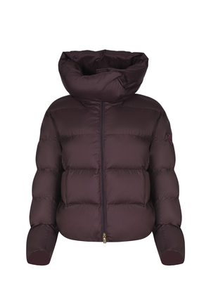 Giubbino Pinko " Giza" realizzato in nylon di colore Borgogna. Opaco. Collo alto con bottoni. Cappuccio. Chiusura frontale con zip a doppio cursore. Tasche laterali con zip. Maniche lunghe. Fondo asimmetrico. Logo Love Birds ricamato tono su tono sulla manica sinistra.100% poliestere