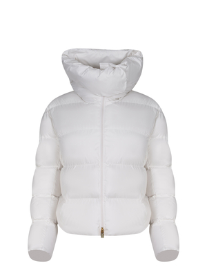 Giubbino Pinko " Giza" realizzato in nylon di colore Bianco. Opaco. Collo alto con bottoni. Cappuccio. Chiusura frontale con zip a doppio cursore. Tasche laterali con zip. Maniche lunghe. Fondo asimmetrico. Logo Love Birds ricamato tono su tono sulla manica sinistra.100% poliestere