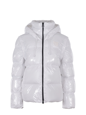 Giubbino Pinko " Indice" realizzato in nylon lucido di colore Bianco. Cappuccio con coulisse. Collo alto. Maniche lunghe. Patch logo " Love Birds" applicato tono su tono sul petto. Chiusura con zip, davanti. Tasche laterali. 100% Poliammide