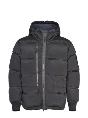 Giubbino Stone Island realizzato in poliammide di colore Grigio antracite. Cappuccio imbottito con coulisse. Maniche lunghe. Polsini a coste elasticizzati. Tasca con zip verticale sul petto. Chiusura con zip a doppio cursore. Tasche laterali con bottone automatico. Tasca interna con bottone. Badge Stone Island sulla manica sinistra. Fondo con coulisse. 100% poliammide