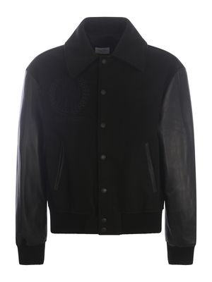 Giubbino varsity Family First in polyestere di colore Nero. Profili in pelle. Colletto alla francese. Maniche lunghe, pelle. Chiusura con ciappe davanti. Tasche laterali.. Polsi e fondo a costine. Lettering logo " Family First Milano" ricamato sul retro. Fodera 100% Poliestere 70% Poliestere, 30% Pelle Made in Italy