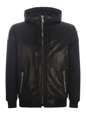 Giubbino Yes London realizzato in vera pelle di colore Nero. Cappuccio con coulisse. Maniche lunghe in nylon. Chiusura con zip. Tasche laterale con zip. Fodera 100% PoliestereVera PelleMade in Italy