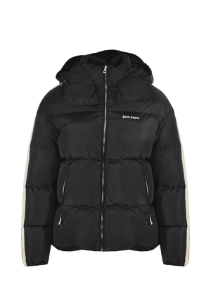 Giubotto Palm Angles in Nylon nero. Cappuccio removibile con bottoni e elastico. Chiusura frontale con zip. Fondo manica elasticizzato. Tasche laterali con zip. Logo ricamato sul davanti. Dettagli laterali con bande avorio. Tasca interna. Imbottitura con piume. 100% poliammide Made in Italy
