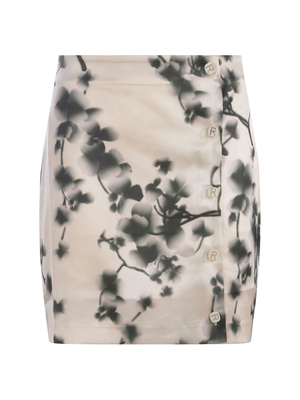 Gonna Rotate in tessuto setoso di colore Crema. Fantasia " Sicomoro" a contrasto all-over. Dettaglio " Bottone" logato. Chiusura a portafoglio.50% Polyestere Riciclato, 47% Polyestere, 3% Elastan Made in China