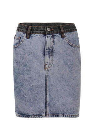 Gonna Rotate realizzata in denim Blu medio. Inserti in denim scuro. Effetto stone wash. Cinque tasche. Chiusura con zip e bottone. Etichetta applicata sul retro. Lettering logo "Rotate" in metallo sull'etichetta. 100% Cotone