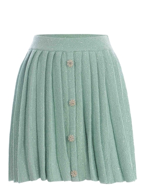 Gonna Self-Portrait realizzata in maglia di colore Verde Menta. Inserti con pailettes ricamati. Vita alta, elasticizzata. Dettaglio bottoni con strass davanti. Gonna plissetatta. 74% Poliestere, 21% Cotone, 5% Lana UK 6
