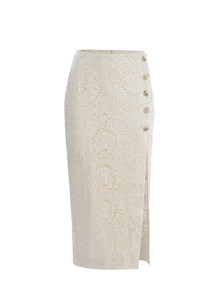 Gonna Self-Potrait realizzata in pizzo floreale di colore Crema. Vita alta. Dettaglio bottoni " Gioiello" laterali. Chiusura con zip sul retro. Spacco laterale. Linea aderente. 77% Poliammide, 23% Viscosa UK 6 - 8 - 10 - 12IT 38 - 40 - 42 - 44