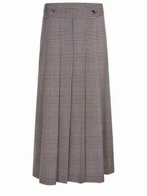 Gonna Solotre realizzata in misto viscosa Multicolor. Motivo Principe di Galles. Plissettata sul davanti. Chiusura a portafoglio sul davanti con bottoni.63% poliestere 34% viscosa 3% elastene Made in Italy