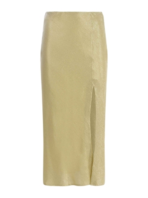 Gonna tubino Forte Forte jacquard in misto cotone e viscosa di colore Oro, filo di lurex e trama tridimensionale. Chiusura con zip invisibile di lato. Spacco laterale. 62% Cotone 22% Viscosa 16% Poliestere metallizzato Made in Italy