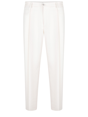 Jeans Briglia realizzato in denim di colore Panna. Chiusura con zip e bottone. Passanti per cintura in vita. Cinque tasche. Tasche laterali. Tasche sul retro con bottoni. Elasticizzato sui lati.98% cotone 2% elastene Made in Italy