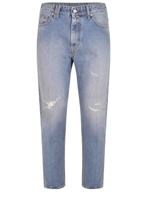 Jeans Cycle realizzato in denim di colore Celeste. Stone wash. Microrotture. Chiusura con bottone e zip. Passanti per cintura in vita. Cinque tasche. Etichetta logo in pelle di colore Cuoio sul retro. Monogram logo applicato sul retro in metallo Argento.100% cotone Made in Italy