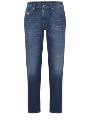 Jeans Diesel realizzato in denim di colore Azzurro. Effetto stone wash. Passanti per cintura. Cinque tasche. Lettering logo inciso sulla tasca. Chiusura con zip e bottone. Etichetta logo applicata sul retro. Logo "D" di colore Rosso sulla tasca sul retro. 98% Cotone 2% Elastan