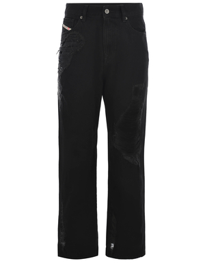 Jeans Diesel realizzato in denim di colore Nero. Dettaglio rotture, davanti. Passanti per cintura. Cinque tasche. Patch logo applicato sulla tasca. Chiusura con zip e bottone. Dettaglio rotture sul fondo. Etichetta logo applicata sul retro.