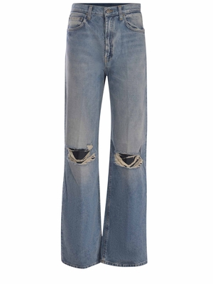 Jeans Dondup " Francine" realizzati in denim di colore Azzurro. Vita bassa. Effetto vintage. Rotture alle ginocchia. Passanti per cintura. Cinque tasche. Chiusura con zip e bottone. Etichetta logo in pelle a contrasto Nero applicata sul retro. Logo "D" in metallo sulla tasca posteriore. Cuciture a contrasto. Wide leg fit. 100% Cotone Made in Italy