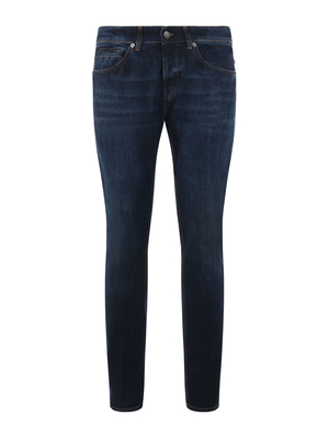 Jeans Dondup " George" in denim stretch Blu scuro stone wash. Aree scolorite. Passanti per cintura. Cinque tasche. Chiusura con bottoni. Logo "D" in metallo applicato sul retro. Vita bassa. Skinny fit.98% Cotone, 2% Elastan Made in Italy
