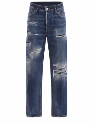 Jeans Dsquared 2 " Boston" realizzato in denim di colore Blu scuro. Effetto stone wash. Microrotture e rattoppi. Passanti per cintura. Cinque tasche. Chiusura con bottoni nascosti. Patch logo a contrasto applicato davanti. Gamba dritta. Etichetta logo in pelle applicata sul retro.99% Cotone, 1% Elastan