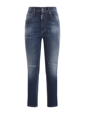 Jeans Dsquared 2 " High Waist Cropped Twiggy" in denim di colore Blu. Lavaggio used con dettagli destroyed. Passanti per cintura. Cinque tasche. Chiusura con bottone e zip coperta. Patch logo a contrasto applicato davanti. Patch logo "D2" in metallo applicato sulla tasca sul retro. Vestibilità Skinny. 98% Cotone, 2% Elastan Made in Italy:
