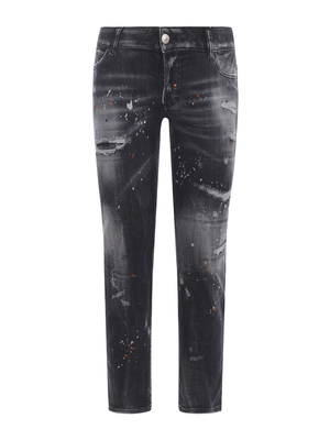 Jeans Dsquared 2 " Jennifer" in denim stretch di clore Nero. Lavaggio Used con dettagli destroyed. Schizzi di pittura Multicolor all-over. Passanti per cintura. Cinque tasche. Chiusura con bottoni. Patch logo applicato davanti. Etichetta logo "DSQ" in pelle di colore Nero. Vestibilità Jennifer. 92% Cotone, 6% Elastomultiester, 2% Elastan Made in Italy