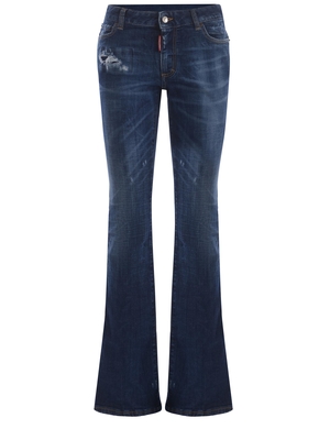 Jeans Dsquared 2 " Medium Waist Flare" realizzato in denim di colore Blu. Effetto stone wash. Rotture e rattoppi. Cinque tasche. Chiusura con zip e bottone. Patch logo a contrasto applicato davanti. Fondo gamba flare. Etichetta logo applicata sul retro. Slim fit. 93% Cotone, 4% Poliestere, 3% Elastan Made in Italy