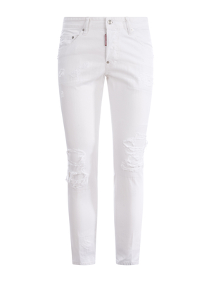 Jeans Dsquared 2 " Skater" in denim di cotone di colore Bianco. Dettagli destroyed. Microrotture. Passanti per cintura. Cinque tasche. Chiusura con bottoni. Patch logo a contrasto davanti. Etichetta logo " Dsquared 2 White Bull" a contrasto Nero. Vestibilità Skater. 100% Cotone Made in Italy