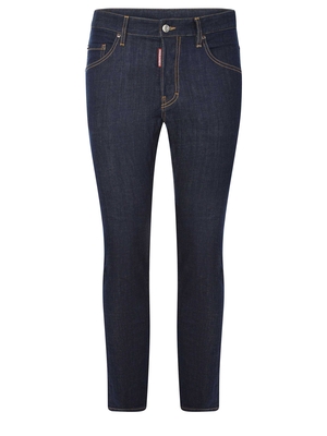 Jeans Dsquared 2 " Skater" realizzato in denim di colore Blu scuro. Passanti per cintura. Cinque tasche. Chiusura con bottoni nascosti. Patch logo a contrasto applicato davanti. Etichetta con lettering logo " Dsquared 2" in pelle di colore Nero applicata sul retro. Skater fit.99% Cotone, 1% Elastan