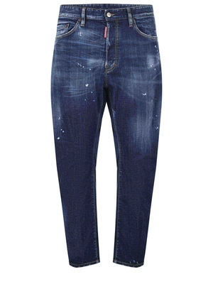 Jeans Dsquared 2 realizzato in denim stretch di colore Blu scuro. Passanti per cintura. Cinque tasche. Chiusura con bottoni nascosti. Patch logo a contrasto applicato davanti. Schizzi di pittura sul davanti e sul retro. Loose fit.98% cotone 2% elastene Made in Italy