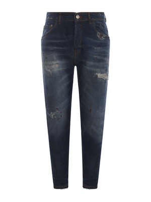 Jeans Yes London " Twist" in denim stretch di colore Blu. Effetto stone wash. Microrotture. Schizzi di pittura a contrasto. Passanti per cintura. Cinque tasche. Chiusura con bottoni. Etichetta logo applicata sul retro. Patch logo applicato sulla tasca.98% Cotone, 2% Elastan Made in Italy