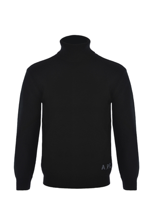 Maglia A.P.C. "Walter" realizzata in lana di colore Nero. Collo alto a costine. Maniche lunghe. Lettering logo "A.P.C." a contrasto Celeste, in basso a sinistra. Polsi e fondo a costine. 100%Lana Vergine