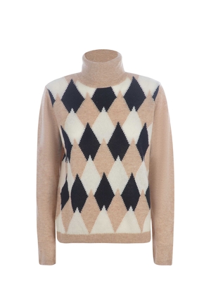 Maglia A.P.C. in lana vergine Beige. Collo alto a costine. Maniche lunghe. Dettaglio forme del diamante Blu Navy/ Beige e Bianco all-over. Polsi e fondo a costine. 100% Lana Vergine Made in Romania