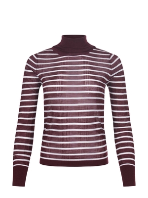 Maglia Alysi realizzata in lana di colore Vino. Semitrasparente. Motivo a righe di colore Bianco. Collo alto. Maniche lunghe. Polsini a costine. Fondo a costine.100% lana merino