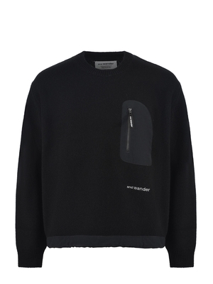 Maglia and Wander in lana Nero. Girocollo. Maniche lunghe. Inserto sul davanti in nylon con taschino chiusura zip. Fondo in nylon con coulisse. Polsi a costine. 100% lanainserti 100% nylon