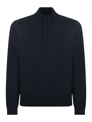 Maglia Boss in misto cotone Blu scuro. Collo alto con zip. Manica lunga. Polsi e fondo a costine. Misura in foto S70% cotone, 30% lana