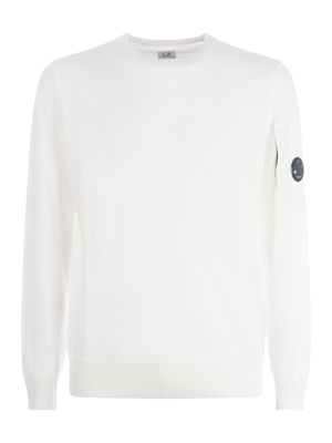 Maglia C.P. Company in filo di cotone di colore Bianco. Girocollo a costine. Maniche lunghe. Tasca con lente iconica sulla manica sinistra. Polsi e fondo a costine. 100% Cotone Made in Moldova