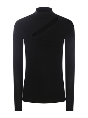 Maglia dolcevita Pinko " Mononoke" in jersey di misto cachemire stretch di colore Nero. Dolcevita. Maniche lunghe. Giromanica leggermente basso. Motivo di cut-out obliquo davanti. Logo " Love Birds" ricamato tono su tono, sotto lo scollo sul retro. Linea aderente 66% Viscosa, 19% Poliammide, 9% Cashmere, 6% Elastan Made in Italy